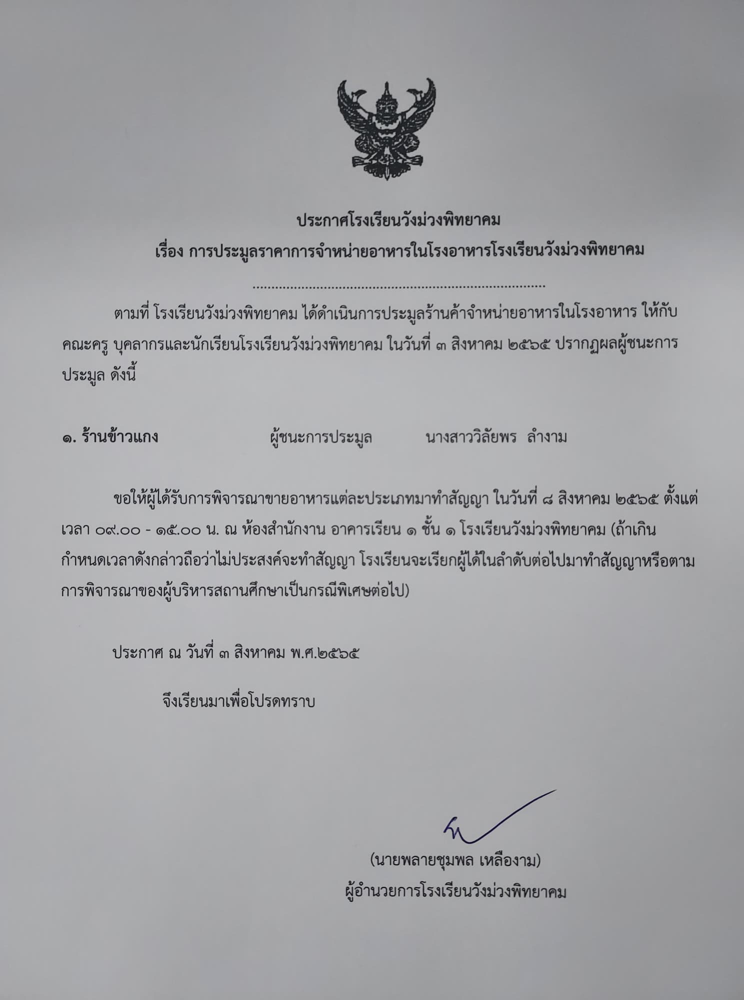 ประกาศผลการประมูลราคาการจำหน่ายอาหารในโรงเรียนวังม่วงพิทยาคม