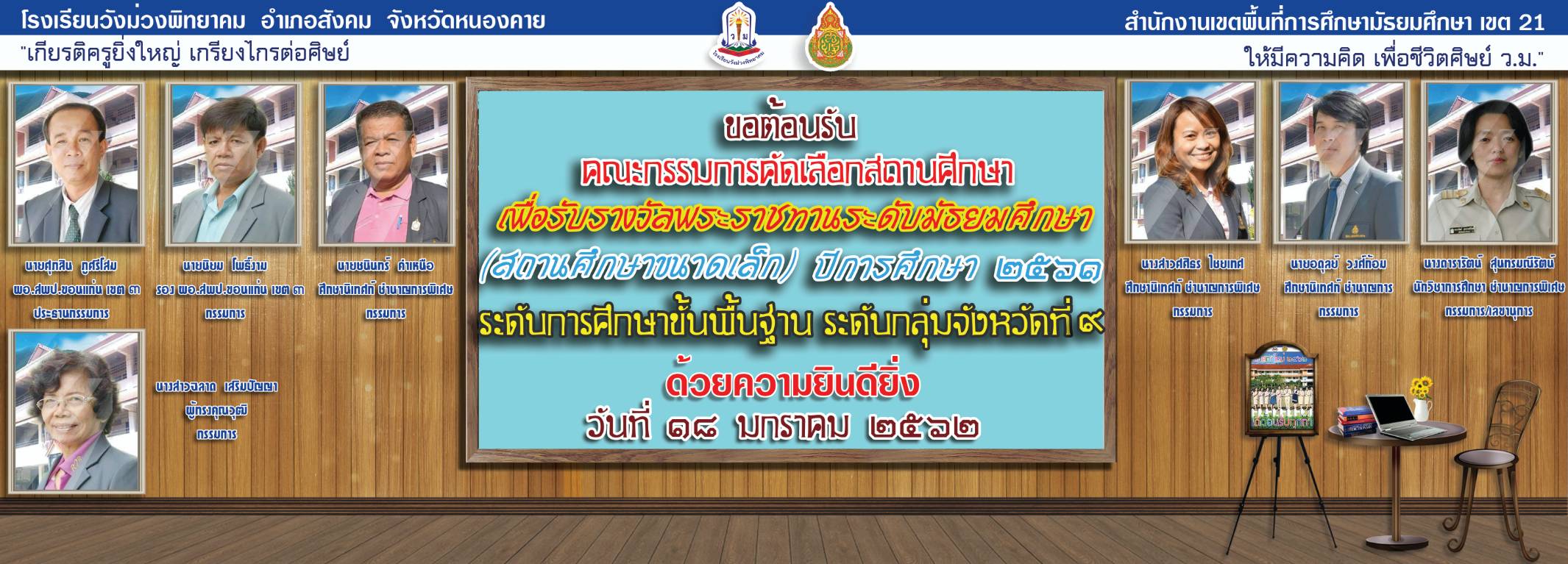 | โรงเรียนวังม่วงพิทยาคม นำโดยนายมหันต์ เวทไธสง ผู้อำนวยการโรงเรียน นายพงษ์เทพ อินทร์อำคำ รองผู้อำนวยการโรงเรียน คณะครู บุคลากรทางการศึกษา และนักเรียน ได้ตอนรับ คณะกรรมการคัดเลือกสถานศึกษาเพื่อรับรางวัลพระราชทาน ระดับมัธยมศึกษา สถานศึกษาขนาดเล็ก ปีการศึกษา 2561 ระดับการศึกษาขั้นพื้นฐาน ระดับกลุ่มจังหวัดที่ 9 โดย มี นายนิยม โพธิ์งาม รอง ผอ. สพป. ขอนแก่นเขต 3 เป็นประธานกรรมการ แทนนายศุภสิน ภูศรีโสม ผอ. สพป. ขอนแก่น เขต 3 เพื่อประเมินสถานศึกษาในการรับรางวัลพระราชทาน ณ โรงเรียนวังม่วงพิทยาคม อำเภอสังคม จังหวัดหนองคาย วันที่ 18 มกราคม 2562
