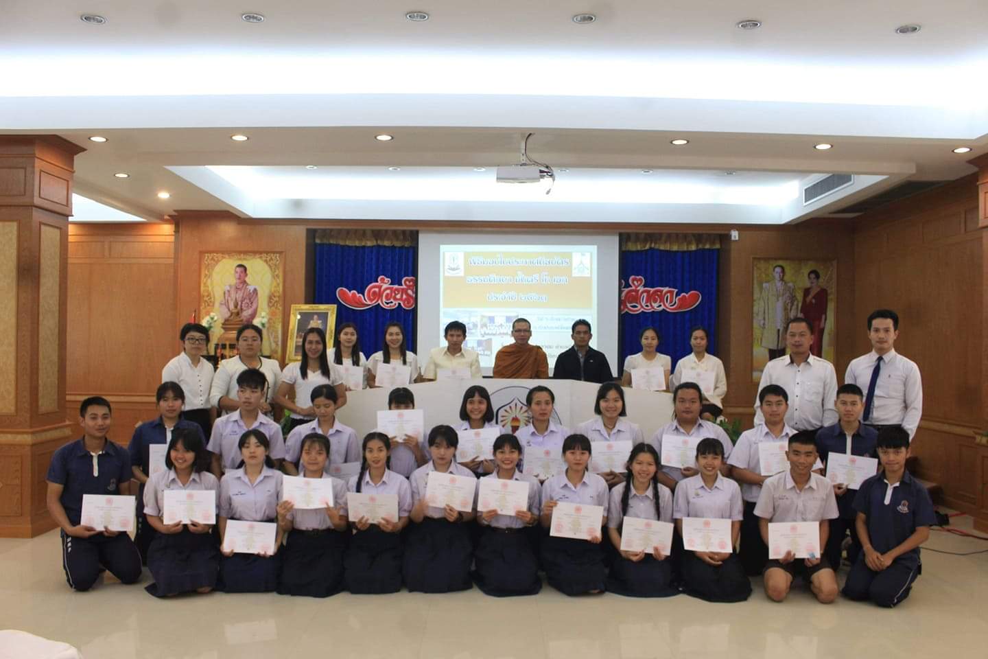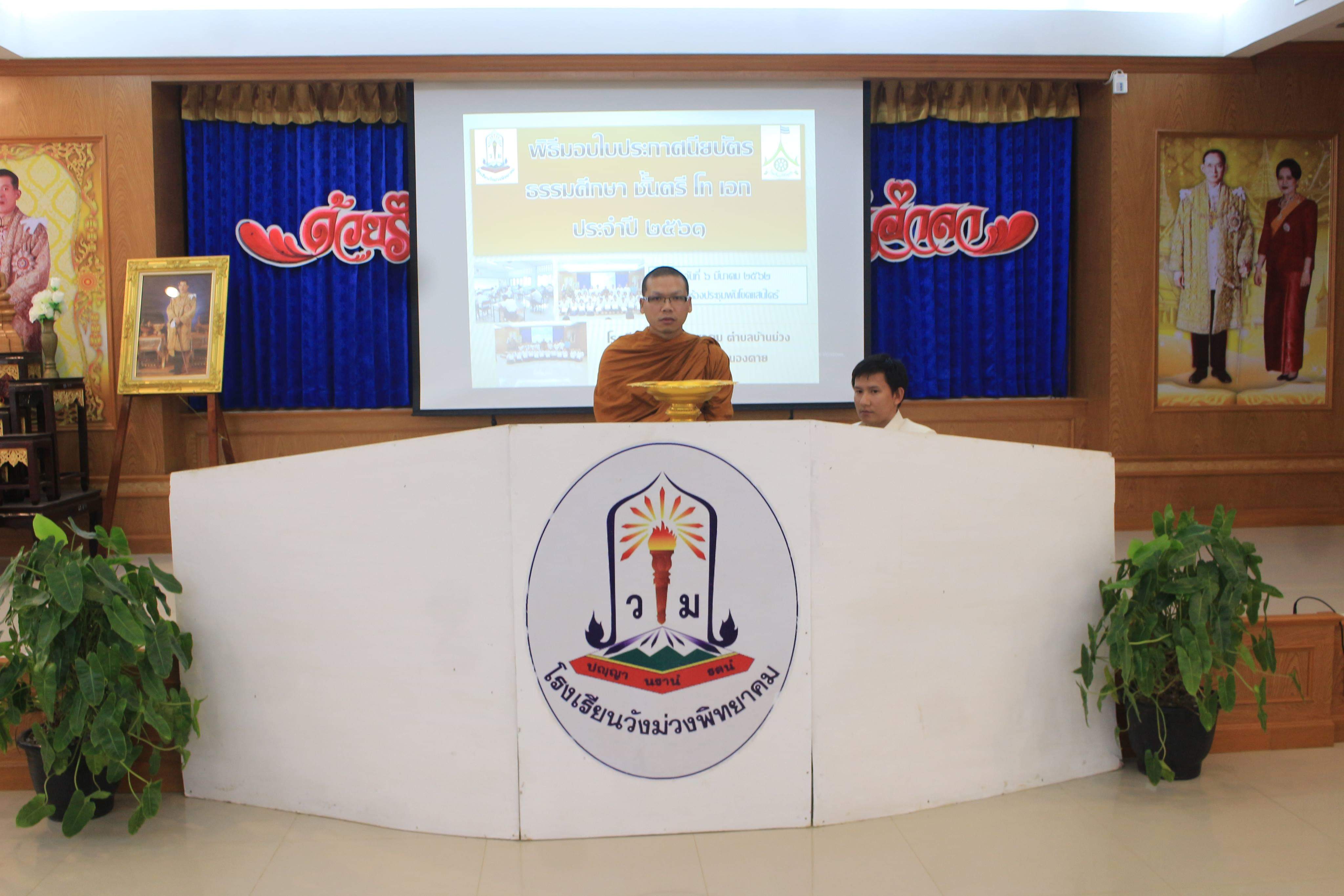 | โรงเรียนวังม่วงพิทยาคมจัดพิธีมอบประกาศนียบัตร การสอบธรรมศึกษา ชั้นตรี โท เอก ปีการศึกษา 2561 แก่คณะครูและนักเรียน ที่ผ่านการสอบธรรมศึกษา โดยมีพระอาจารย์ไพโรจน์เจ้าอาวาสวัดป่าโนนสว่าง บ้านโนนสว่าง ตำบลบ้านม่วง จังหวัดหนองคาย เป็นผู้มอบประกาศนียบัตร ณ ห้องประชุมพันโขดแสนไคร้ โรงเรียนวังม่วงพิทยาคม |
