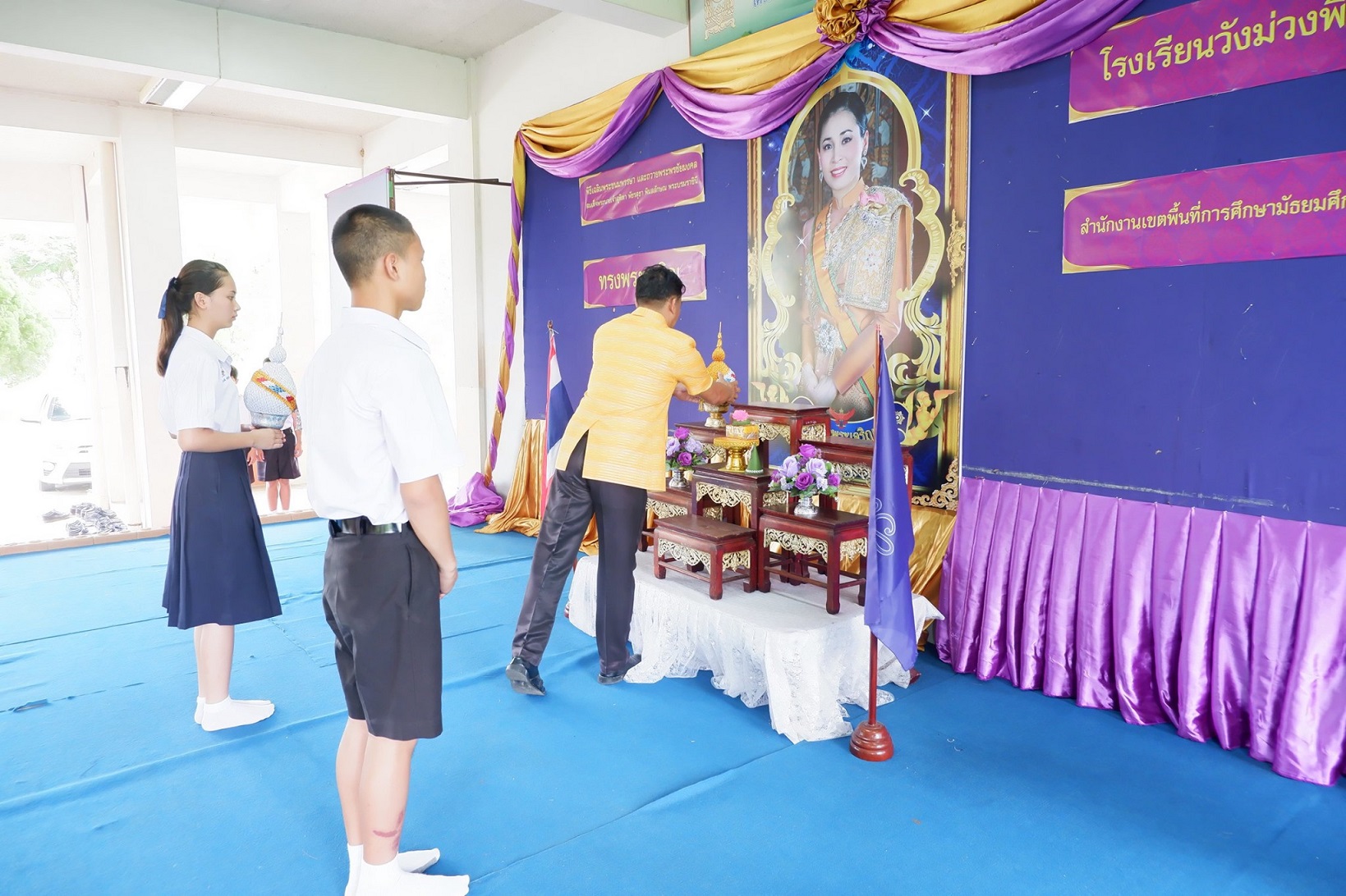 | เมื่อเวลา 13.00 น. วันที่ 7 มิ.ย. บริเวณลานกิจกรรมโรงเรียนวังม่วงพิทยาคม นายมหันต์เวทไธสง ผู้อำนวยการโรงเรียน เป็นประธานในพิธีถวายเครื่องราชสักการะ เบื้องหน้าพระฉายาลักษณ์สมเด็จพระนางเจ้าสุทิดา พัชรสุธาพิมลลักษณ พระบรมราชินี เนื่องในโอกาสวันเฉลิมพระชนมพรรษา โดยมี คณะครูพร้อมด้วยนักเรียน เข้าร่วมในพิธีอย่างพร้อมเพรียง จากนั้น นายมหันต์ เวทไธสง ได้กล่าวถวายราชสดุดีเฉลิมพระเกียรติ และถวายพระพรชัยมงคล และร้องเพลงสรรเสริญพระบารมี “สดุดีจอมราชา" ขณะคณะครูพร้อมนักเรียน ต่างเปล่งเสียง “ทรงพระเจริญ” ดังกึกก้อง |